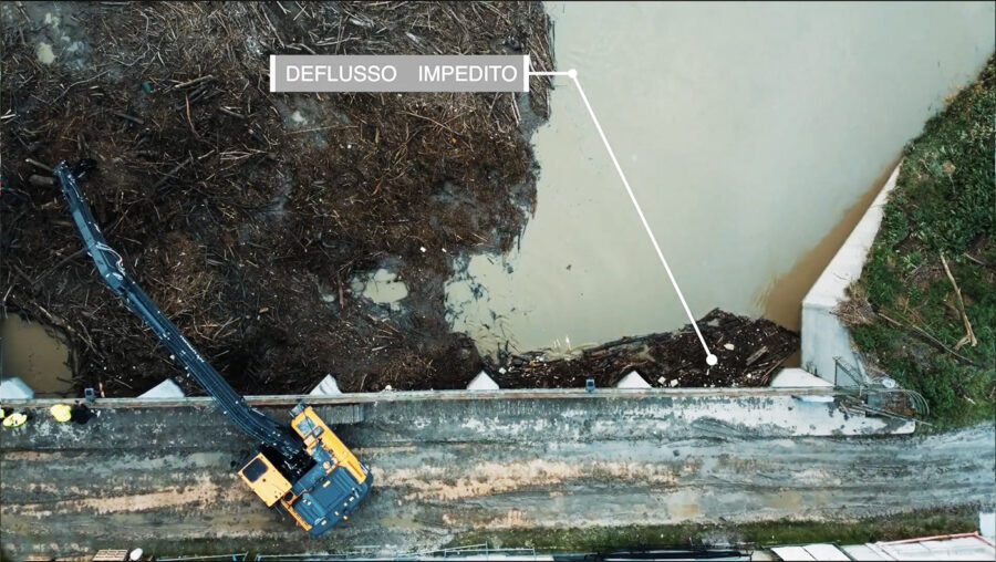 Le immagini aeree iniziali mostrano una situazione critica: l’alveo del torrente Idice completamente ostruito da fitti grovigli di rami e tronchi. Questo accumulo di materiale flottante si è concentrato a ridosso di un’importante struttura idraulica, bloccandone le paratie e impedendo il regolare deflusso delle acque. Questa condizione rappresentava un grave rischio per la tenuta degli argini, poiché la pressione esercitata dall’acqua e dai detriti avrebbe potuto causare esondazioni, mettendo in pericolo le aree circostanti.